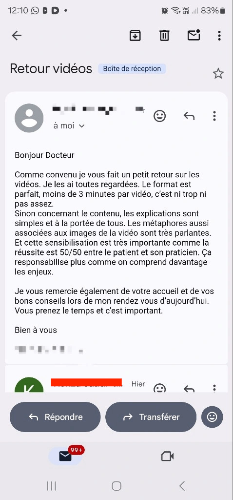 "Tes vidéos sont un régal à regarder ! C'est un excellent moyen de communiquer avec mes patients en attendant la consultation."